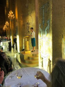 Rob: One of my own highlights, was the reception at Stockholm City Hall. The building is impressive enough on the outside, but the inside is even more incredible. The Blue Hall (which isn’t actually blue) is where the Nobel Prizes are given out, and a staircase at the far end leads up to the Golden Hall (which is VERY golden) where we were addressed by a representative of Stockholm City Council as well as Vanessa Joosen from the University of Antwerp, each of whom spoke about the impacts of children’s literature on their respective communities and the world at large. Food and wine were not in short supply!